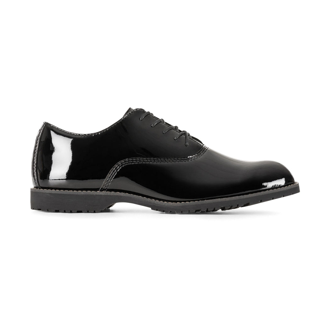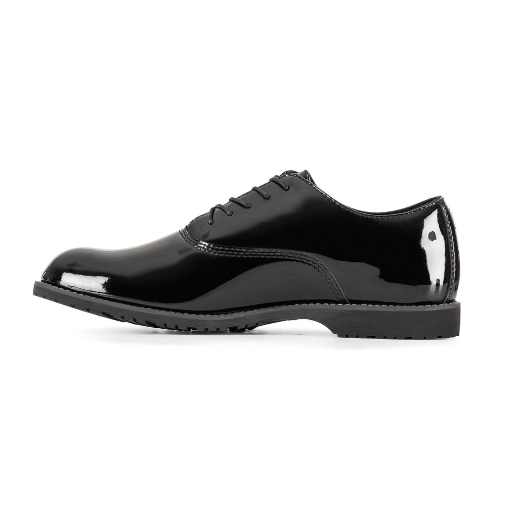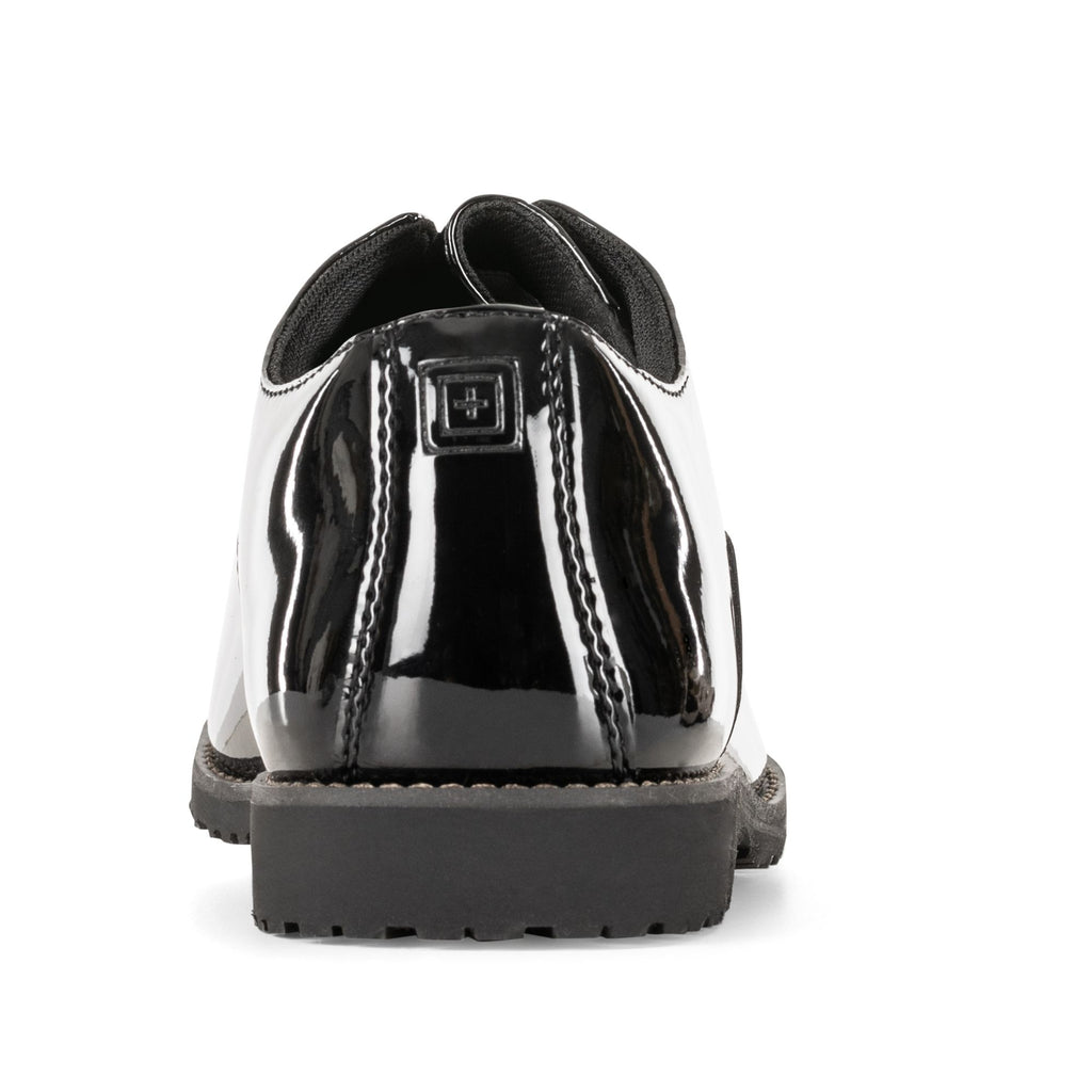 The 5.11® Duty Oxford Hi Gloss is the dress uniform shoe that combines a sharp look with a comfortable feel. The inside has been designed with your comfort in mind. The Ortholite® footbed provides increased cushioning. The outside has been designed so you can put your best foot forward. The tough Vibram® outsole and high shine patent leather upper lets you look as good as you feel.