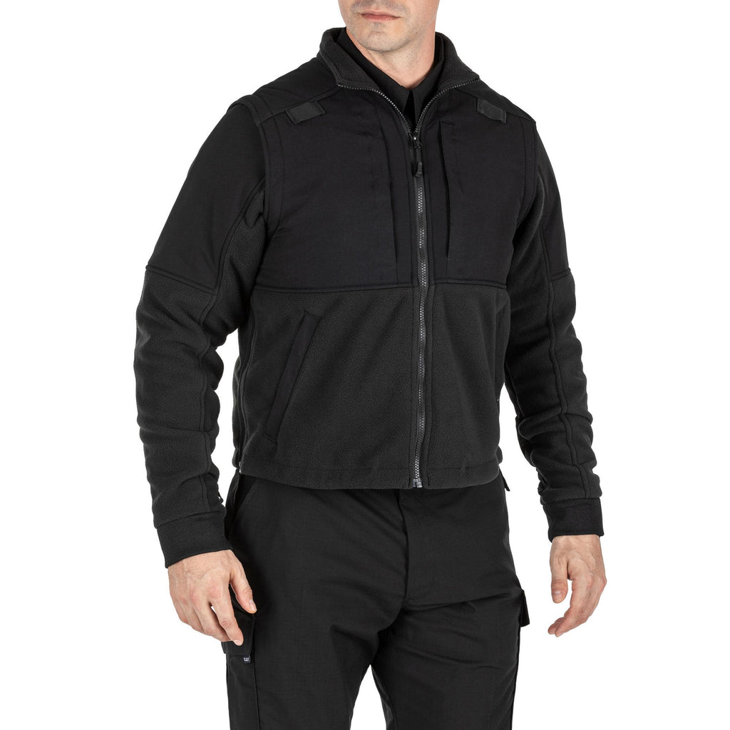 Compromise is not an option when lives and safety are on the line. Professionals need the best when working in the worst weather and conditions. That’s why we’ve introduced our 5-in-1 Jacket 2.0. It’s 8% lighter than its predecessor and much more flexible thanks to an outer shell of mechanical stretch polyester. The fully seam-sealed 10K waterproof and 10K breathable fabric with DWR provides Blood Borne Pathogen resistance*. When it’s pouring, cover up with the removable hood that can be rolled into the collar or stored in back pocket. A new Quixip® system on the sides offers enhanced ventilation and rapid firearm access. The two-piece setup’s removable interior liner features zip-off sleeves and a side zipper to provide even more versatility. Tech fleece construction ensures years of service and, when coupled with the shock cord at the hem, keeps warmth in. Add a pair of document pockets on both layers, and you have the 5.11® answer to tough situations. Imported.