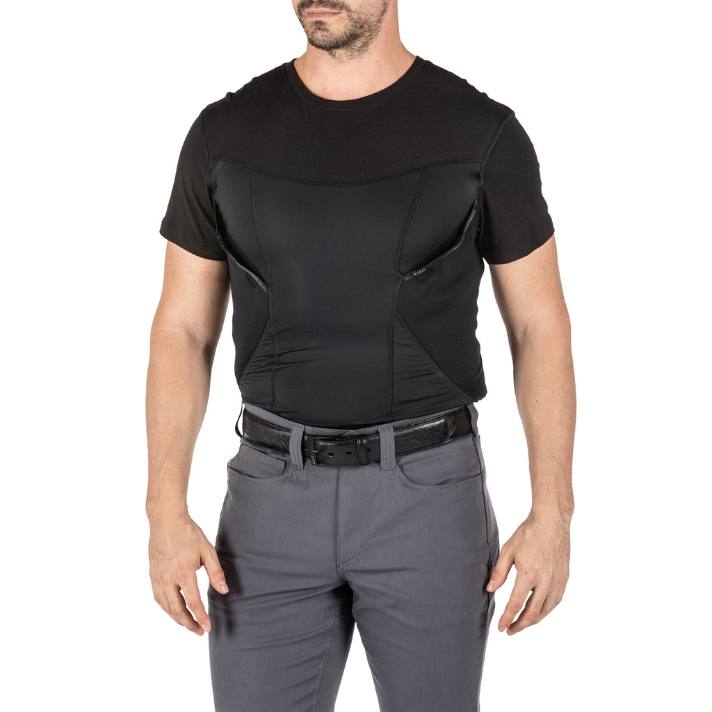 The CAMS™ next-gen compression base layer tee is an outstanding concealed carry alternative to IWB or appendix-carry. It’s built with a tee style upper body using a 4.1 oz. 60% cotton/40% polyester jersey above a compression-fit lower body. Both are moisture wicking, but the top looks like a typical, everyday t-shirt - perfect to wear beneath a collared shirt or similar garment. A body pocket on either side for firearm and/or accessories provides a quick, comfortable, extremely low visibility solution for a firearm in any sort of casual or off-duty environment. The integral odor control fabric and 4mm ultralite Ortholite® padding will keep you comfortable while fighting the funk of sustained activity.