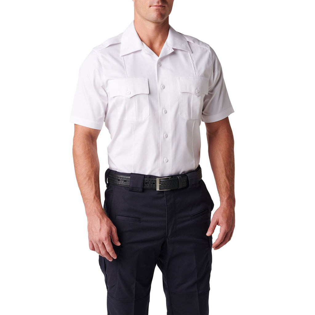 The 5.11 Tactical Men's NYPD Stryke Twill Short Sleeve Uniform Shirt 71401 meets the NYPD Spec for uniform shirts and is made with 5.11's Patented Flex-Tac mechanical stretch twill fabric for performance, durability and easy movement. Sewn-in military creases, epaulettes and scalloped chest pockets with pen guides. Button-front closure with an NYPD Approved label sewn into the front placket. Embroidery eyelets on left chest and each collar.
