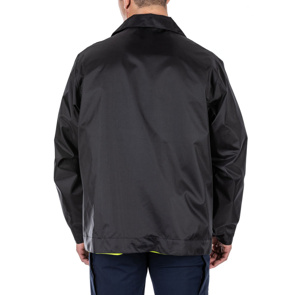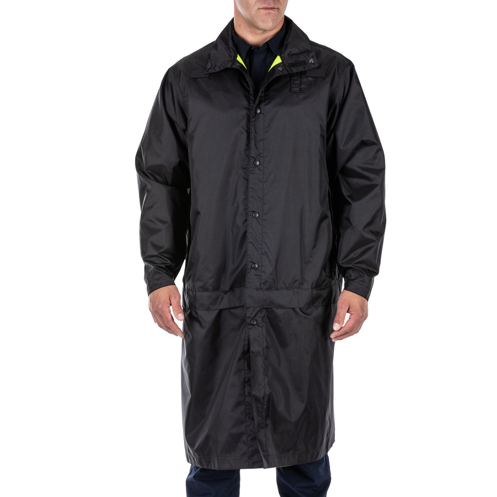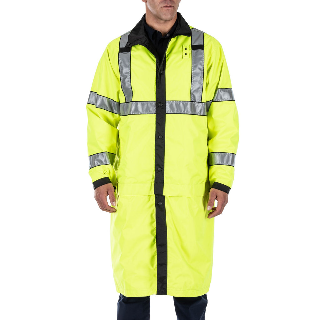 A configurable rain coat, and then some. The bottom of the Long High Vis Rain Coat detaches for situations you can handle in a parka-length coat. For situations that require high visibility, the coat reverses from standard patrol duty black to High Vis ANSI/ISEA 107-2020 Type R&P, Class 3 Certified, with 3M® Scotchlite® reflective tape. The coat’s waterproof, breathable, seam-sealed nylon construction will keep you dry. And mic loops, badge tabs, and pass-through pockets will keep you ready. Sometimes, duty calls when it’s pouring. What rain? Imported.