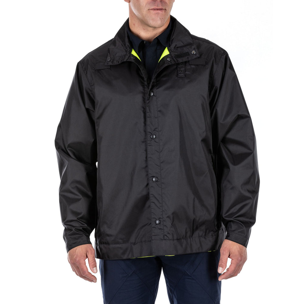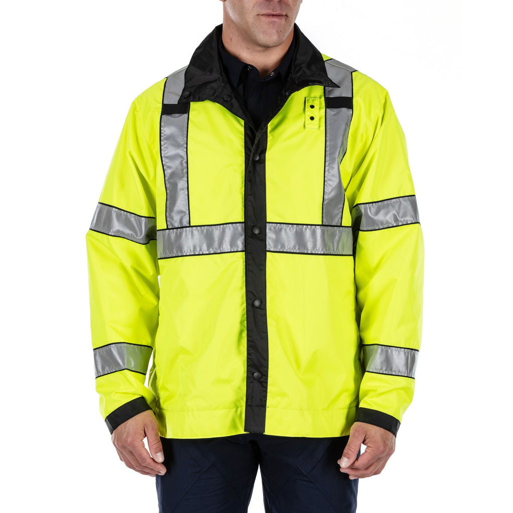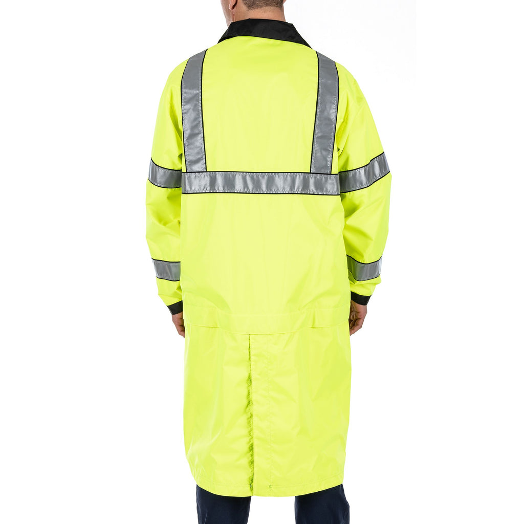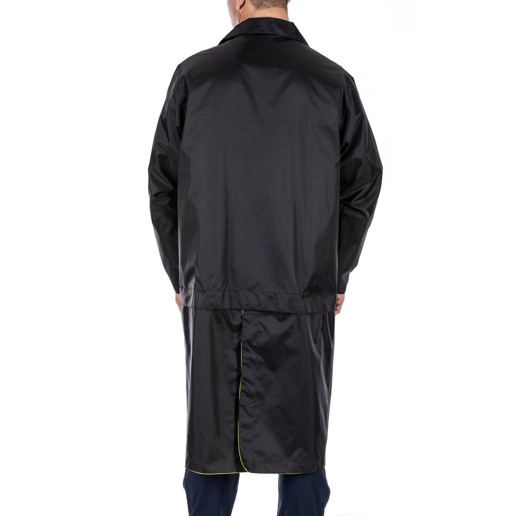 A configurable rain coat, and then some. The bottom of the Long High Vis Rain Coat detaches for situations you can handle in a parka-length coat. For situations that require high visibility, the coat reverses from standard patrol duty black to High Vis ANSI/ISEA 107-2020 Type R&P, Class 3 Certified, with 3M® Scotchlite® reflective tape. The coat’s waterproof, breathable, seam-sealed nylon construction will keep you dry. And mic loops, badge tabs, and pass-through pockets will keep you ready. Sometimes, duty calls when it’s pouring. What rain? Imported.