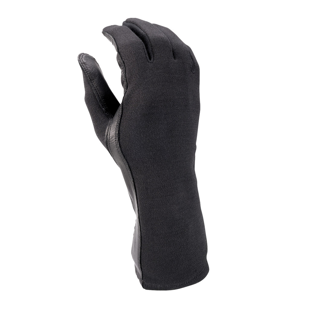 These Flight gloves are modeled to US military specifications. They are constructed of a knit blend using Nomex® fibers and are sewn with Nomex® thread. They feature a palm made of premium goatskin leather noted for its long-lasting durability and abrasion resistance. This high-performance construction is flexible even after heat exposure.