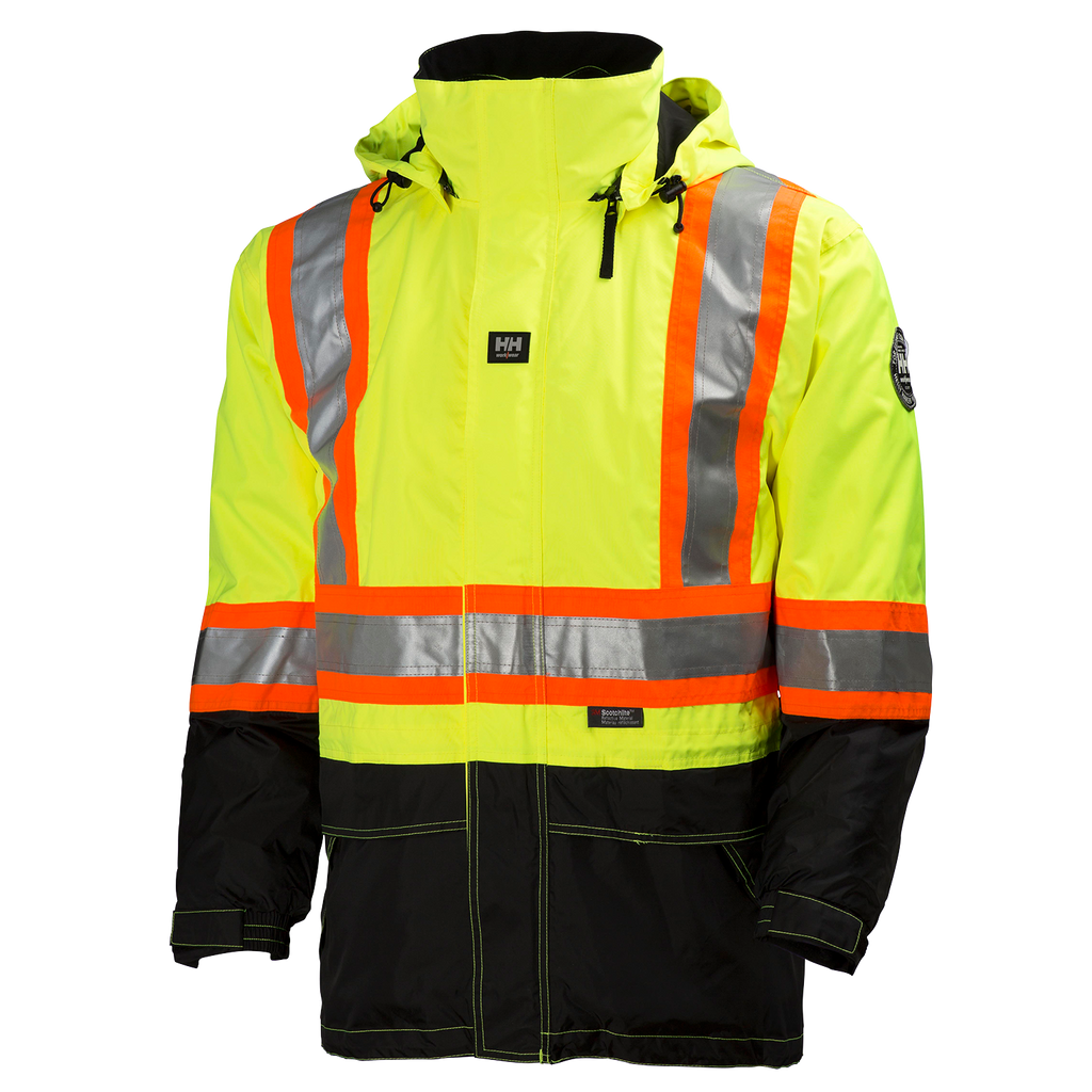 • Helly Tech® waterproof and breathable jacket includes: (1) zipper under sleeve for ventilation, (2) chest pockets with zip closure, (1) mobile pocket with pen pocket on right chest, (2) hand pockets with zip closure, (2) elastic cuffs with Velcro® adjustment, (1) map pocket under storm flap, (1) detachable hood with draw cord adjustment, (1) drawcord adjustment at waist and hem, (1) zipper inside jacket for logo applications