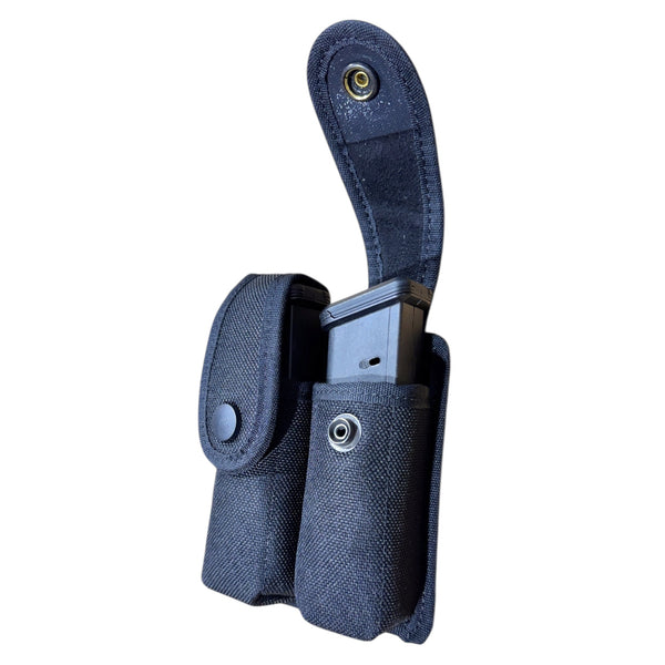 For two magazines (Glock 9mm or Sig P228 .357 or .40). Two separate pouches, adjustable flaps, "Double-directional" fastening system allow horizontal or vertical positioning. For right or left-handed officers.